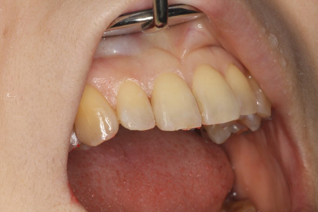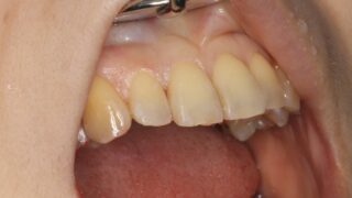 写真の患者様は以前治療した場所の段差と着色変化が気になるとのご相談でした。前歯の修復治療にはレジンという材料を使用しますが、写真の患者様は材料が歯肉にやや被ってしまい色は経年変化で茶色に変色しており、一部う蝕になっておりました。(レジンは吸水性があるため年数を経ると色が変化していきます)