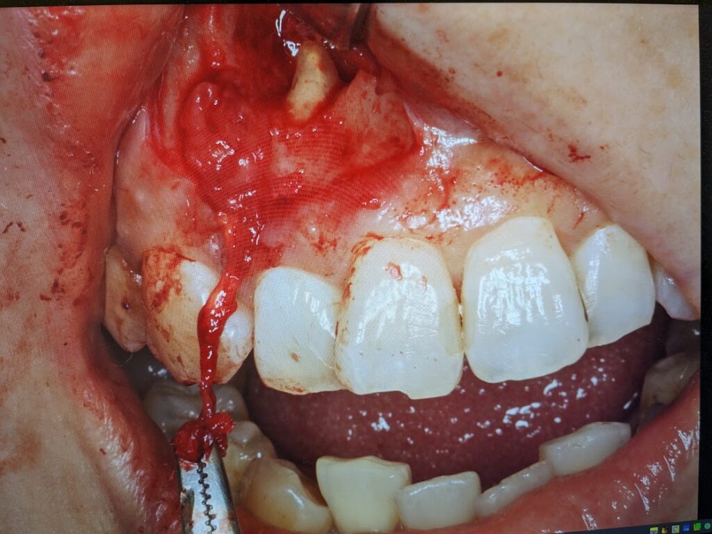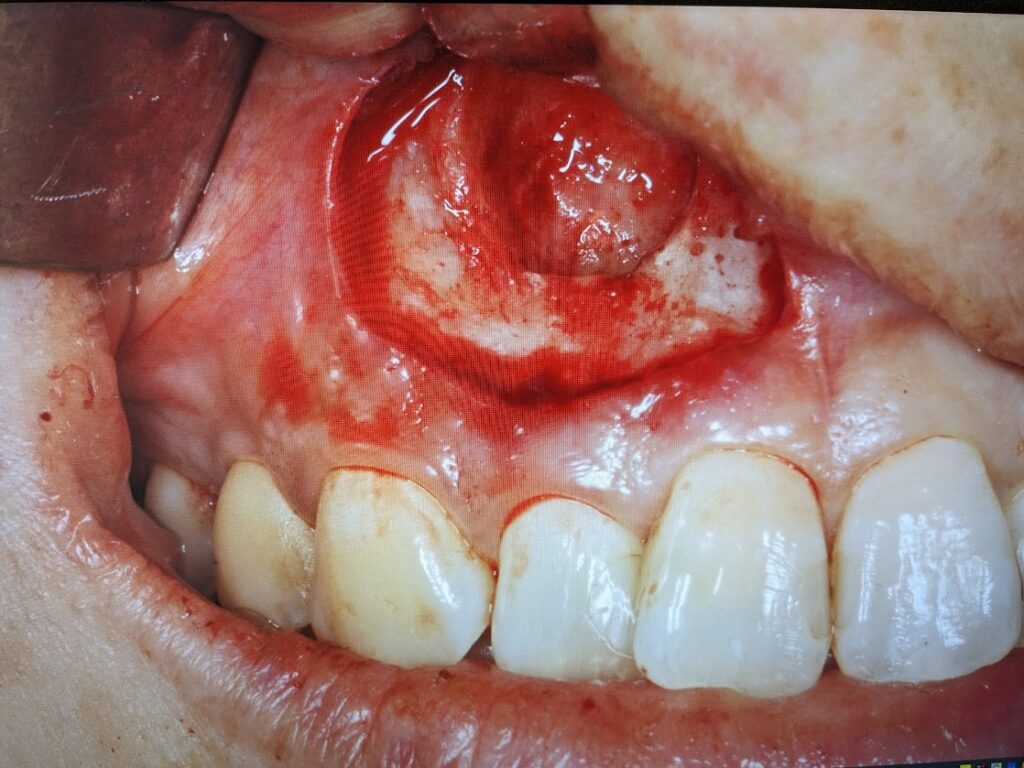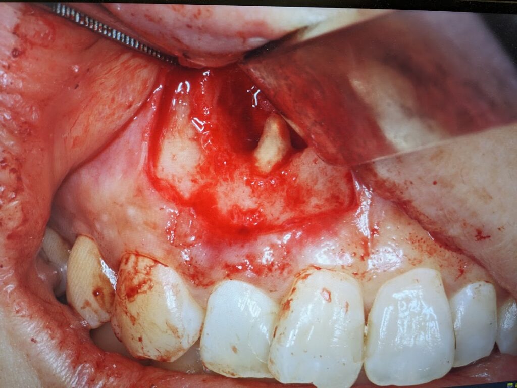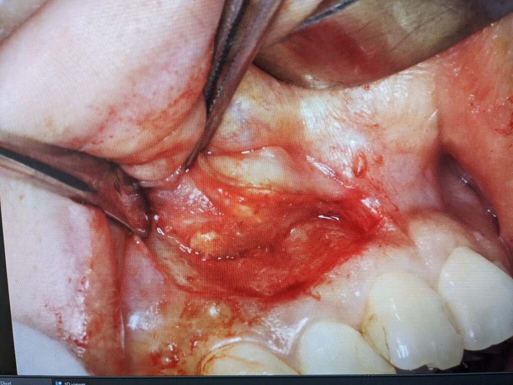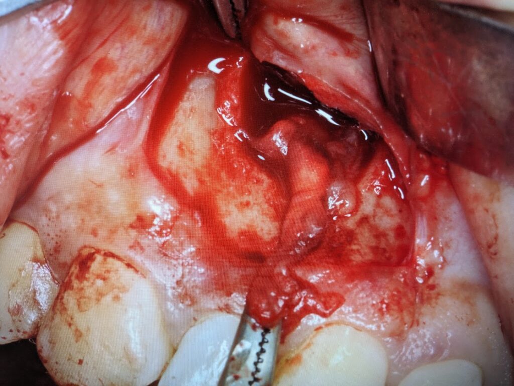 歯肉退縮を避けるように切開線を設定して歯肉粘膜骨膜弁を剥離していきますと骨膜と癒着した嚢胞壁が認められました。骨膜と癒着した嚢胞壁をできるだけ丁寧に剥離していきます。マイクロスコープを使用しますと裸眼で手術するより骨膜と嚢胞壁の堺目が良く分かります。