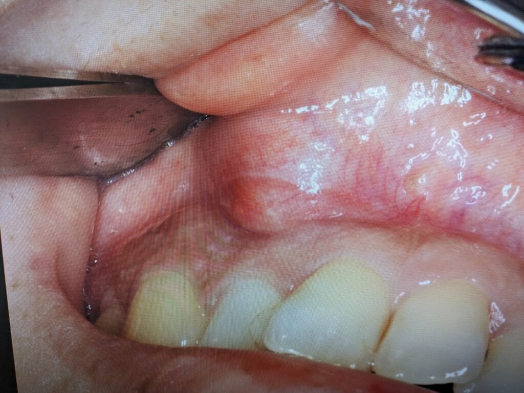 初診時の口腔内写真です。右上2の根尖部のやや硬めで小豆大の膨隆を認めました。