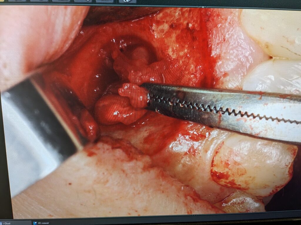 嚢胞を摘出しますと、原因である右上2の歯根が露出されます。
