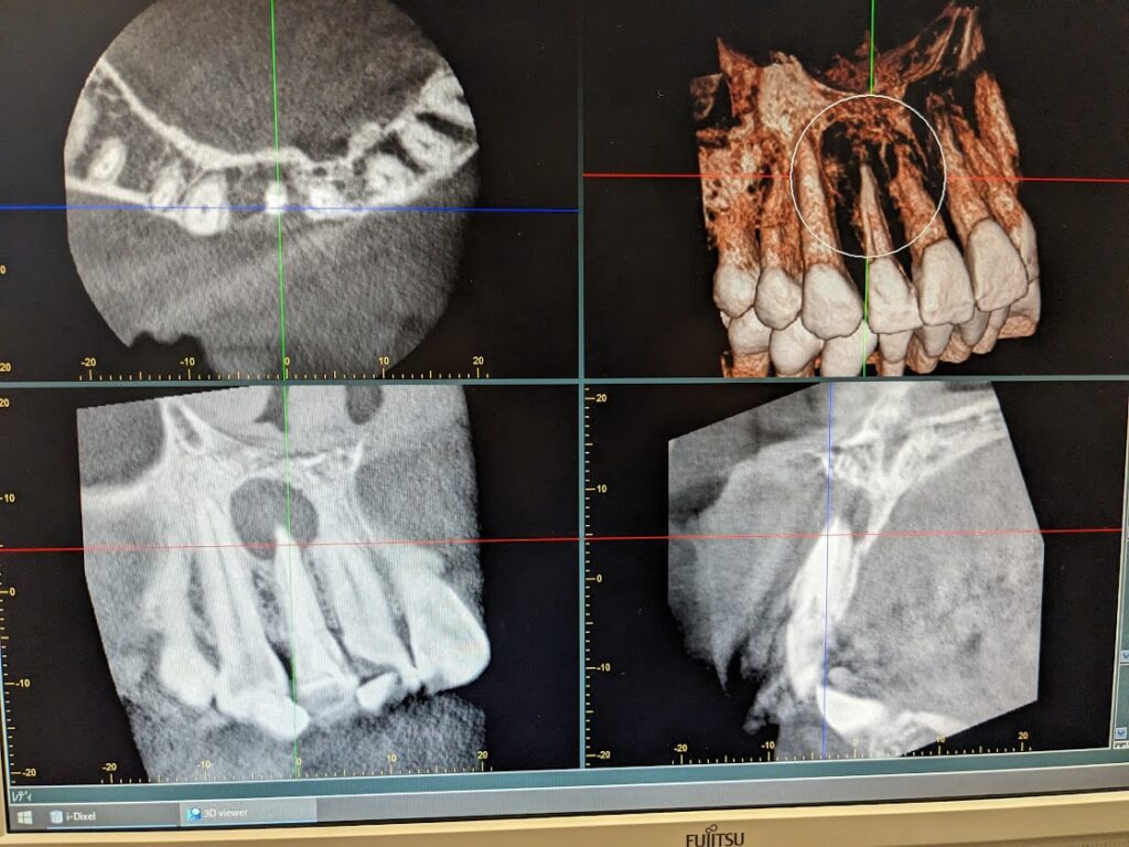 右上2の根管内には白い不透過像を認め根管充填されています。根尖部の透過像をみとめ頬側に膨隆を認める事からCTにて精査を実施することとしました。