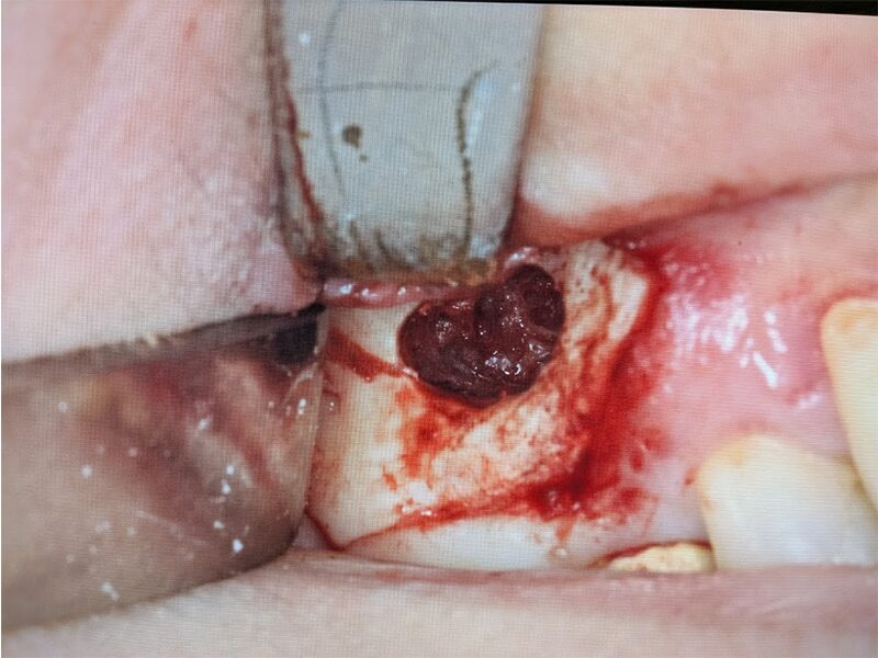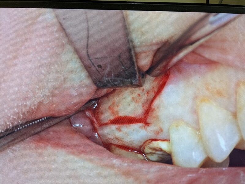 切開後、歯肉粘膜骨膜弁を剥離し、翻転します。頬側の皮質骨の吸収は認めません。